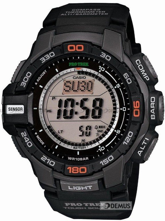 Polecamy elegancki zegarek męski Casio ProTrek PRG-270-1ER dla Panów, którzy cenią sobie dodatki z charakterem. Jednym z ważnych elementów decydujących o wyglądzie zegarka jest pasek z tworzywa. Zegarek jest napędzany przez mechanizm kwarcowy - solar ze wskaźnikiem naładowania. Koperta z tworzywa zapewnia bezpieczeństwo i wygodę. Producent gwarantuje klasę wodoszczelności na poziomie WR100.Nowoczesna, elektroniczna tarcza bardzo dobrze pasuje do całej konstrukcji. Zegarek pokazuje czas w trybie 12- oraz 24-godzinnym. Tarcza została dodatkowo podświetlona z wykorzystaniem technologii Auto El Backlight. Do ochrony tarczy wykorzystano szkiełko mineralne, które zapewnia wysoką odporność na zarysowanie i stłuczenie. Jednym z niewątpliwych atutów zegarka jest kalendarz automatyczny. Zegarek wyposażono w funkcję budzika z możliwością ustawienia pięciu niezależnych alarmów na różne dni i godziny - budzik oferuj też funkcją drzemki. Jedną z przydatnych funkcji tego zegarka jest 24-godzinny timer. Warto zwrócić uwagę na jeszcze jedną funkcję tego modelu, czyli termometr działający w zakresie od –10 do 60°C z dokładnością do 0,1°C. Z myślą o turystach producent wyposażył zegarek w cyfrowy kompas z dokładnością do 1°.