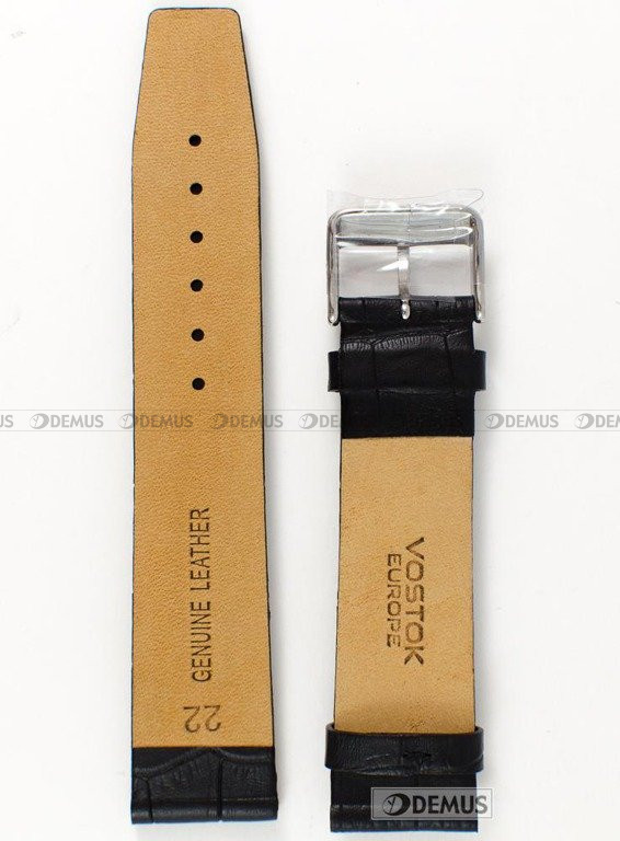 Czarny skórzany pasek z bydlęcej skóry o fakturze krokodyla przeznaczony do zegarków Vostoke Europe Gaz-14 Dual Time występuje w modelu 2426-5601059. Szerokość paska to 22 mm, natomiast klamra jest koloru srebrnego błyszczącego. Pasek jest gruby na około 3 mm.