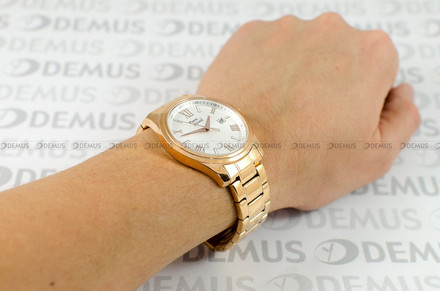 wykonana z wysokiej jakości stali szlachetnej. Stop ten charakteryzuje się najwyższym stopniem odporności na korozję. Koperta jest pozłacana
