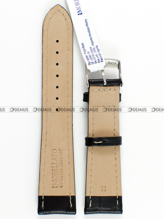 Pasek do zegarka Morellato A01U3252480019CR22 z naturalnej skóry. Prezentowany pasek ma kolor czarny. Długość paska wynosi 17,5 cm (od klamerki do ostatniego otworu). Istotnym parametrem każdego paska jest jego szerokość, która w przypadku tego modelu wynosi 22 mm (18 mm przy klamerce).Parametry techniczne