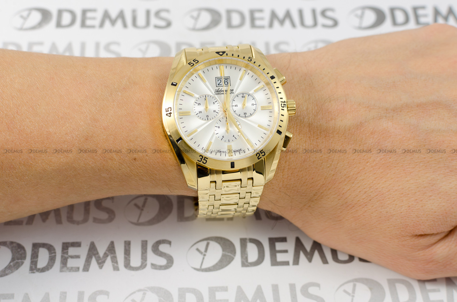 Gorąco polecamy wyjątkowy zegarek Adriatica Mens Fashion A8202.1113CH dla Panów ceniących sobie nie tylko styl i elegancję, ale także funkcjonalność. Kluczowym elementem decydującym o wyglądzie urządzenia jest stalowa, pozłacana bransoleta. Sercem tego modelu jest mechanizm kwarcowy zasilany baterią. Stalowa - pozłacana koperta to połączenie komfortu użytkownika i trwałości urządzenia. O najwyższej jakości zegarka świadczy m.in. klasa wodoodporności WR100.Srebrna, wskazówkowa tarcza to idealne połączenie stylu i funkcjonalności. Zegarek prezentuje czas w tradycyjnej 12-godzinnej formie. Zegarek został dodatkowo wyposażony w datownik pokazujący dzień miesiąca. Do ochrony tarczy wykorzystano odporne na zarysowania i stłuczenia szkło szafirowe.
