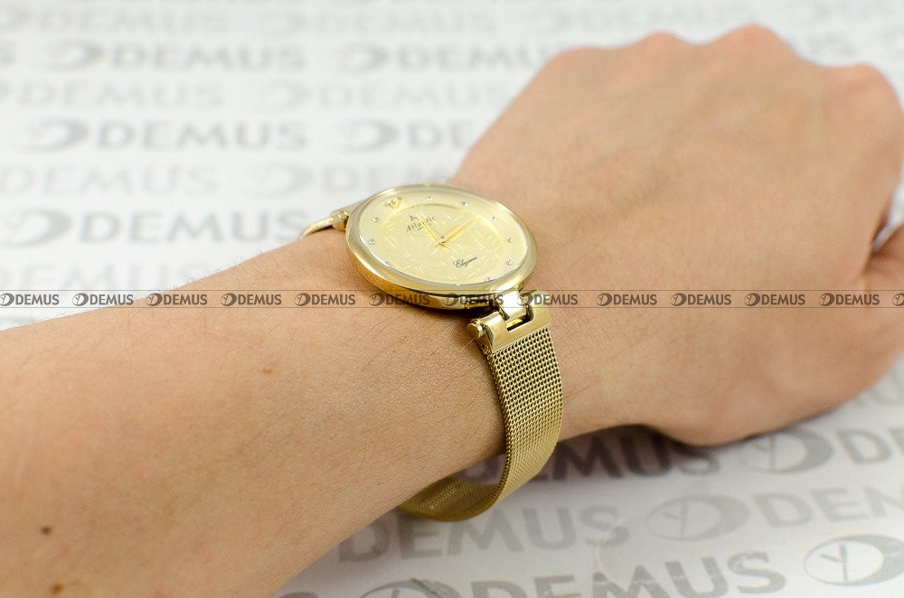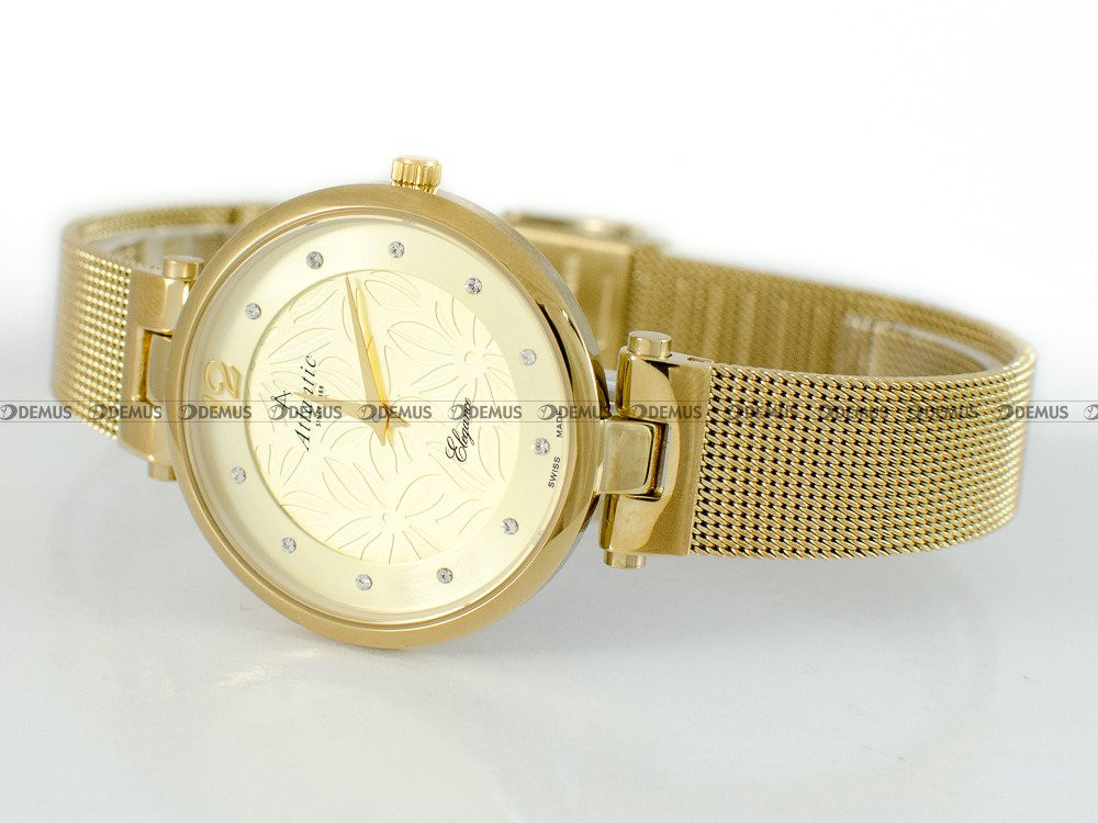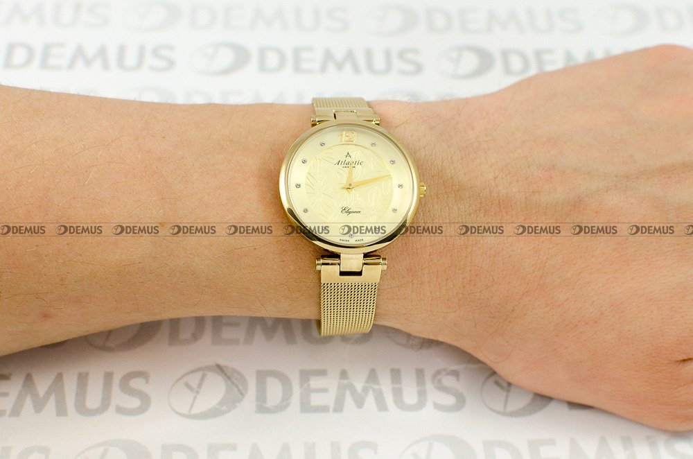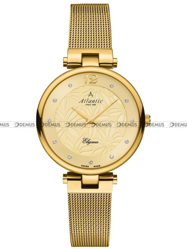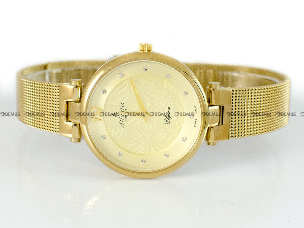 Polecamy elegancki zegarek Atlantic Elegance 29037.45.31MB dla Pań, które cenią sobie dodatki z charakterem. Jednym z ważnych elementów decydujących o wyglądzie tego modelu jest stalowa, pozłacana bransoleta. Sercem tego zegarka jest niezawodny mechanizm kwarcowy. Okrągła, stalowa - pozłacana koperta jest najlepszą gwarancją trwałości tego zegarka. Klasyczna, wskazówkowa tarcza w kolorze złotym wysadzana kryształkami bardzo dobrze pasuje do całej konstrukcji. Tarcza zegarka jest chroniona przez odporne na zarysowania i stłuczenia szkiełko szafirowe.Model ten jest objęty gwarancją producenta przez 2 lata od zakupu.