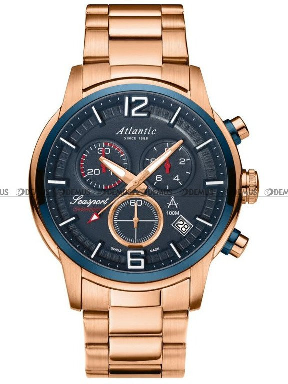 Polecamy elegancki zegarek Atlantic Seasport 87466.44.55 dla Panów, którzy cenią sobie dodatki z charakterem. Ważnym elementem wykończenia urządzenia jest stalowa, pozłacana bransoleta. Sercem urządzenia jest niezawodny mechanizm kwarcowy zasilany baterią. Stalowa - pozłacana koperta to połączenie komfortu użytkownika i trwałości urządzenia. Zegarek cechuje się klasą wodoodporności WR100.Wskazówkowa tarcza w kolorze różowego złota jest elementem wyróżniającym ten model spośród innych zegarków. Datownik pokazuje aktualny dzień miesiąca. Do ochrony tarczy wykorzystano odporne na zarysowania i stłuczenia szkło szafirowe.