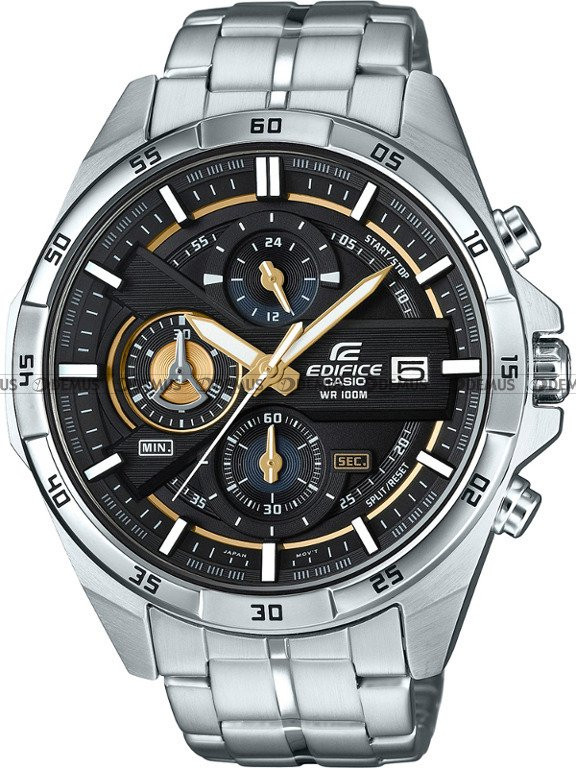 Markowy zegarek Casio Edifice Chronograph EFR-556D-1AVUEF to świetny prezent dla Panów, którzy cenią sobie elegancję i szyk. Kluczowym elementem decydującym o wyglądzie urządzenia jest stalowa bransoleta. Zegarek jest napędzany przez niezawodny mechanizm kwarcowy. Okrągła, stalowa koperta to połączenie komfortu użytkownika i trwałości urządzenia. Urządzenie zostało dodatkowo uszczelnione przy użyciu zakręcanego dekla. Producent deklaruje dla tego modelu klasę wodoszczelności WR100. Czarna, wskazówkowa tarcza podkreśla ekskluzywny charakter tego modelu. Zegarek został wyposażony w datownik pokazujący aktualny dzień miesiąca. Wskazówki urządzenia zostały pokryte warstwą fosforyzującą Neobrite ułatwiającą korzystanie z zegarka w ciemności. Do ochrony tarczy zegarka wykorzystano szkiełko mineralne, które zapewnia wysoką odporność na zarysowanie i stłuczenie.Model ten jest objęty 3-letnią gwarancją producenta z opcją rozszerzenia do 6 lat (za dopłatą).