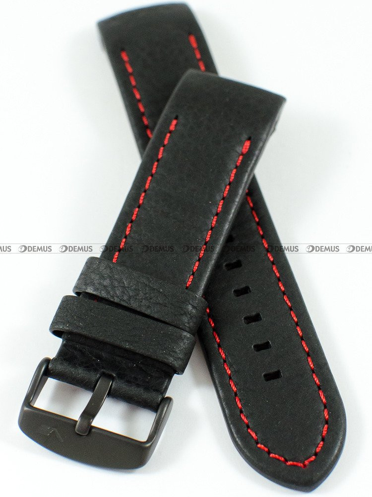 Pasek skórzany do zegarka męskiego Vostok Europe Anchar 6S30-5104244. Pasek posiada kolor głębokiej czerni z przeszyciem wykonanym za pomocą nici w kolorze czerwonym, przez co zegarek nabiera charakteru sportowego. Klamra logowana logiem Vostok w kolorze matowym, czarnym. Mocowanie na teleskop 24 mm.