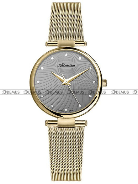 Zachęcamy do zapoznania się z ofertą tego zegarka - Adriatica Ladies fashion A3689.1147Q to oferta przede wszystkim dla Pań dbających o każdy aspekt stylizacji. Jednym z ważnych elementów decydujących o wyglądzie urządzenia jest siateczkowa - Mesh, pozłacana bransoleta. Sercem tego zegarka jest niezawodny mechanizm kwarcowy. Okrągła, stalowa - pozłacana koperta to najlepsza gwarancja trwałości tego modelu. Klasyczna, wskazówkowa tarcza w kolorze grafitowym wysadzana kryształkami bardzo dobrze pasuje do całej konstrukcji. Tarcza zegarka jest chroniona przez szkiełko mineralne, które zapewnia wysoką odporność na zarysowanie i stłuczenie.Model Adriatica Ladies fashion A3689.1147Q jest objęty 2-letnią gwarancją.
