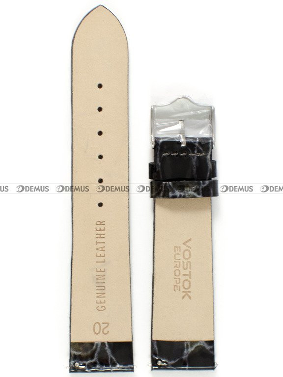 Pasek skórzany do modeli damskich zegarków Vostok Europe Rocket N-1 Lady. Pasek w kolorze czarnym, perłowym z niestandardowym, unikalnym wzorem w kolorze srebrnym. Klamra w kolorze srebrnym błyszczącym. Szerokość paska to 20 mm. Pasek mocowany na teleskop.