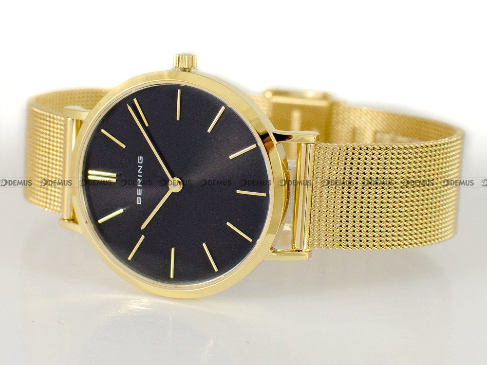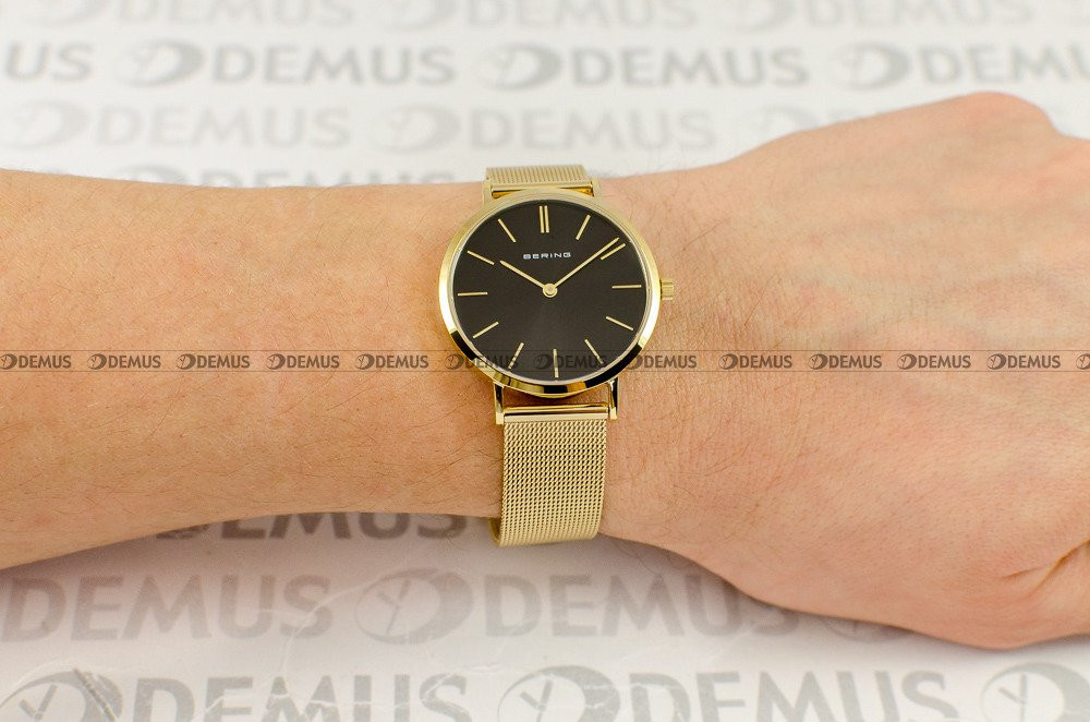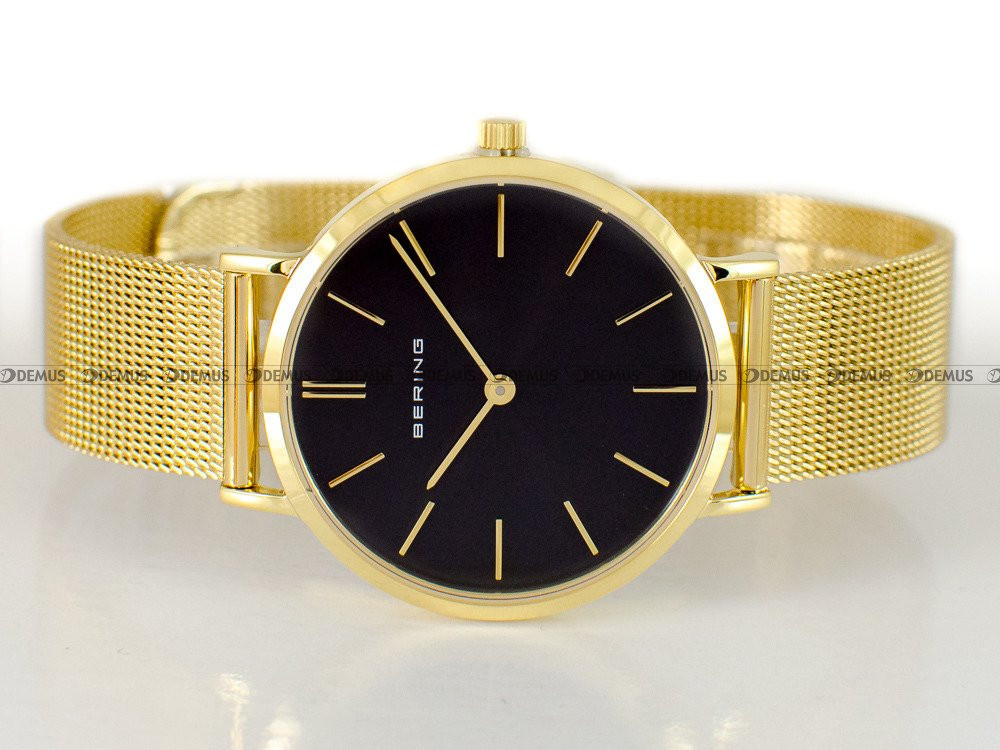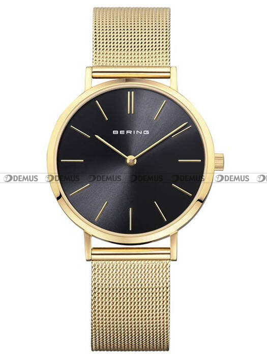 Oryginalny zegarek Bering 14134-332 to wymarzony gadżet dla Pań, które lubią uzupełnić stylizację atrakcyjnym dodatkiem. Kluczowym elementem decydującym o wyglądzie urządzenia jest siateczkowa - Mesh, pozłacana bransoleta. Zegarek jest napędzany przez niezawodny mechanizm kwarcowy zasilany baterią. Okrągła, stalowa - pozłacana koperta to najlepsza gwarancja trwałości tego zegarka.Klasyczna, wskazówkowa tarcza w kolorze czarnym bardzo dobrze pasuje do całej konstrukcji. Do ochrony tarczy zegarka wykorzystano szkło szafirowe, które zapewnia wysoką odporność na zarysowanie i stłuczenie.