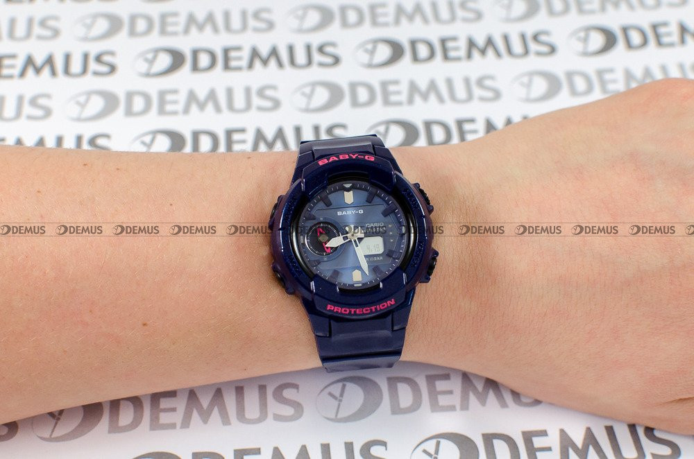 Markowy zegarek Casio Baby-G BGA-230S-2AER to propozycja głównie dla Pań ceniących sobie atrakcyjne dodatki. Kluczowym elementem decydującym o wyglądzie tego modelu jest pasek z tworzywa. Model ten jest napędzany przez mechanizm kwarcowy. Do ochrony mechanizmu zegarka wykorzystano technologię Casio G-Shock. Koperta z tworzywa skutecznie chroni mechanizm zegarka, jednocześnie zapewniając odpowiedni komfort. Wysoka jakość urządzenia przekłada się na klasę wodoodporności na poziomie WR100. Niebieska, wskazówkowo-elektroniczna tarcza jest elementem wyróżniającym ten model spośród innych zegarków. Do podświetlenia tarczy wykorzystano technologię LED. Wskazówki zostały dodatkowo pokryte warstwą fosforyzującą Neobrite ułatwiającą odczytywanie godziny w ciemności. Do ochrony tarczy wykorzystano szkiełko mineralne, które zapewnia wysoką odporność na zarysowanie i stłuczenie.Atutem zegarka Casio Baby-G BGA-230S-2AER jest funkcja kalendarza automatycznego. Zegarek wyposażono w prosty budzik. Wielu użytkowników zapewne doceni timer z możliwością odliczania czasu od 60 minut. Zegarek znajdzie zastosowanie w sporcie, poniewaz oferuje 60-minutowy stoper elektroniczny z dokładnością do jednej sekundy.
