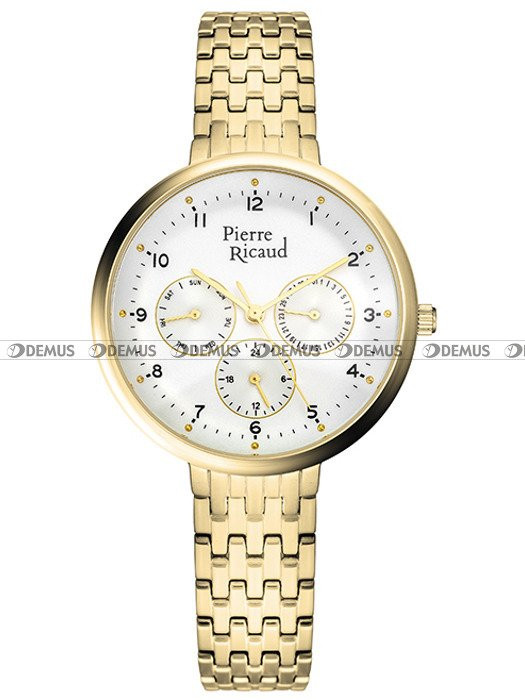 Elegancki zegarek Pierre Ricaud P22089.1123QF to doskonały produkt przede wszystkim dla Pań, które cenią sobie elegancję i szyk. O niezwykłym charakterze czasomierza decyduje m.in. stalowa, pozłacana bransoleta. Sercem zegarka jest mechanizm kwarcowy zasilany baterią. Okrągła, stalowa - pozłacana koperta jest najlepszą gwarancją trwałości tego modelu. Zegarek cechuje się klasą wodoodporności WR50.Klasyczna, wskazówkowa tarcza w kolorze srebrnym podkreśla ekskluzywny charakter tego modelu. Zegarek pokazuje czas w trybie 12- oraz 24-godzinnym. Tarcza urządzenia jest chroniona przez odporne na zarysowania i stłuczenia szkiełko mineralne.