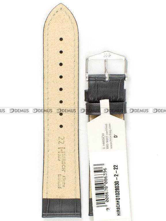Markowy pasek do zegarka Hirsch 01028030-2-22 z tradycyjnej, naturalnej skóry. Pasek ma kolor grafitowy. Długość paska (liczona od klamerki do ostatniego otworu) to 17,5 cm. Szerokość tego paska to 22 mm i 20 mm przy klamerce.Parametry techniczne
