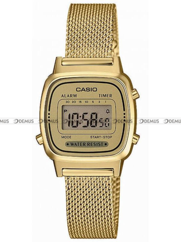 Gorąco polecamy markowy zegarek Casio RETRO LA670WEMY-9EF dla Pań, które cenią sobie elegancję i szyk. Ważnym elementem wykończenia urządzenia jest siateczkowa - Mesh, pozłacana bransoleta. Zegarek jest napędzany przez mechanizm kwarcowy. Prostokątna, koperta z tworzywa idealnie pasuje do tego modelu. Elektroniczna tarcza jest wyrazistym i jednocześnie funkcjonalnym dopełnieniem tego modelu. Tarcza urządzenia jest chroniona przez odporne na zarysowania i stłuczenia szkiełko mineralne. Jedną z zalet tego modelu jest kalendarz automatyczny. Urządzenie wyposażono w prosty budzik. Funkcjonalność zegarka obejmuje prosty timer. Z myślą o sportowcach i osobach aktywnych fizycznie zegarek wyposażono w stoper elektroniczny do 1h z dokładnością do 0,1s.Model Casio RETRO LA670WEMY-9EF jest objęty 3-letnią (bezpłatnie) lub 6-letnią (za dopłatą) gwarancją.