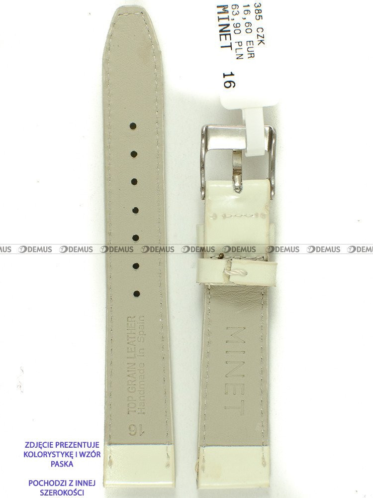 Oryginalny pasek do zegarka Minet MSOUI18 wykonany z tradycyjnej, naturalnej skóry. O niezwykłości tego modelu paska decyduje przede wszystkim jego beżowy kolor. Długość paska wynosi 16 cm liczona od klamerki do ostatniego otworu. Szerokość tego modelu to 18 mm (16 mm przy klamerce).Parametry techniczne
