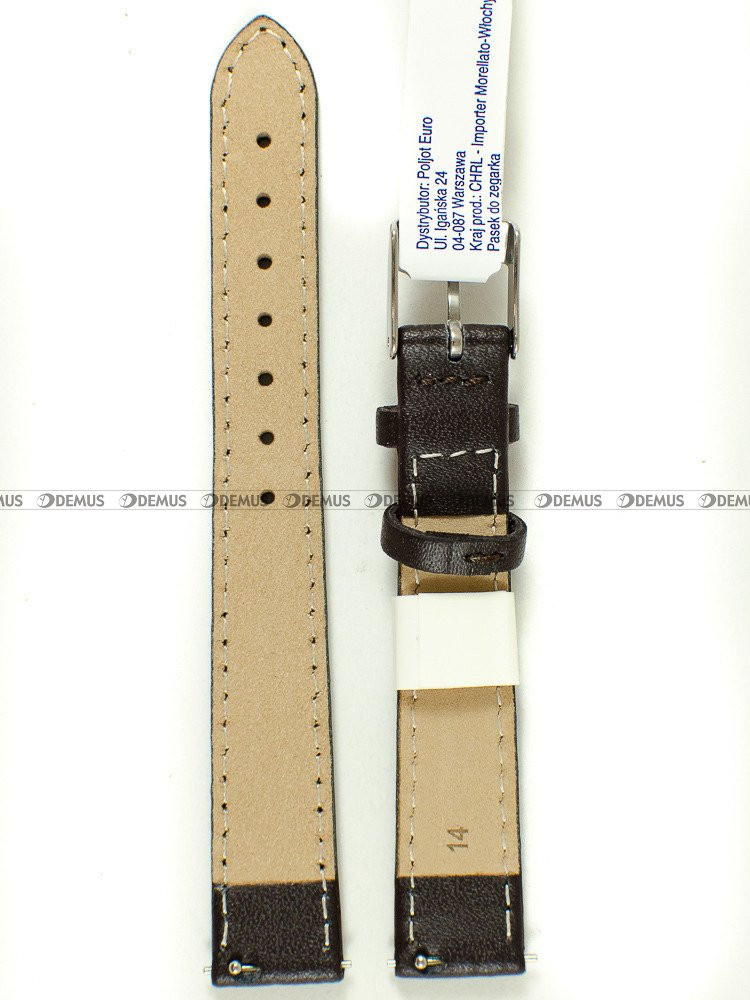 Polecamy oryginalny pasek do zegarka Morellato A01X5202875032CR14 wykonany z naturalnej skóry. O niezwykłości tego modelu paska decyduje przede wszystkim jego brązowy kolor. Długość paska wynosi 16 cm liczona od klamerki do ostatniego otworu. Jednym z najważniejszych parametrów paska jest oczywiście jego szerokość, która w tym przypadku wynosi 14 mm (12 mm przy klamerce).Parametry techniczne