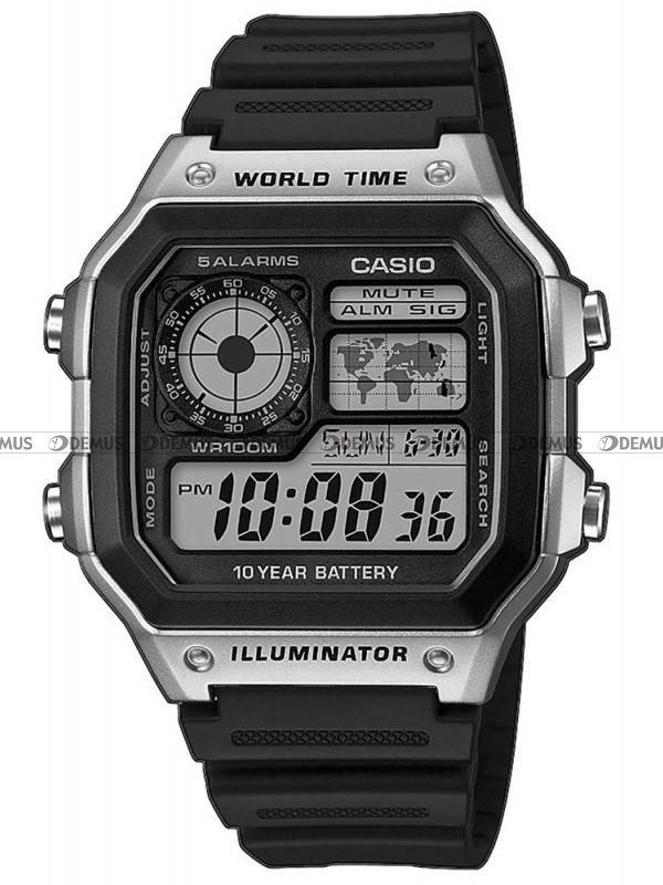 Model Casio AE-1200WH-1CVEF to model zaprojektowany przede wszystkim dla Panów ceniących sobie funkcjonalne i eleganckie dodatki. Wygodę w codziennym użytkowaniu zapewnia pasek z tworzywa. Zegarek jest napędzany przez sprawdzony mechanizm kwarcowy zasilany baterią. Prostokątna, koperta z tworzywa jest najlepszą gwarancją trwałości tego modelu. Zegarek zapewnia wodoszczelności na poziomie WR100. Elektroniczna tarcza to idealne połączenie stylu i funkcjonalności. Zegarek pokazuje czas w trybie 12- oraz 24-godzinnym. Ważną cechą tego zegarka jest technologia LED wykorzystana do podświetlenia tarczy. Do ochrony tarczy zegarka wykorzystano odporne na zarysowania i stłuczenia szkiełko hesalitowe.Jedną z największych zalet tego modelu jest kalendarz automatyczny. Urządzenie wyposażono w budzik z możliwością ustawienia pięciu alarmów. Jedną z przydatnych funkcji tego zegarka jest timer 24h. Z myślą o sportowcach i osobach aktywnych fizycznie zegarek wyposażono w 24-godzinny stoper działający z dokładnością do 1/100 sekundy.