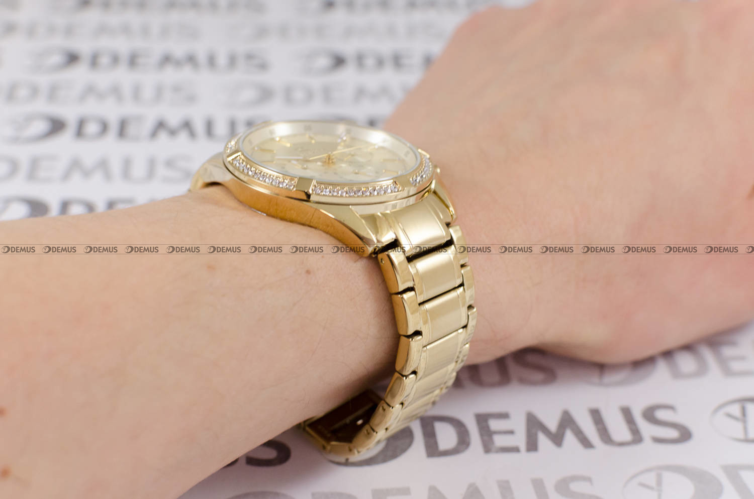 wykonana z wysokiej jakości stali szlachetnej. Stop ten charakteryzuje się najwyższym stopniem odporności na korozję. Koperta jest pozłacana i dodatkowo wysadzana kryształkami.