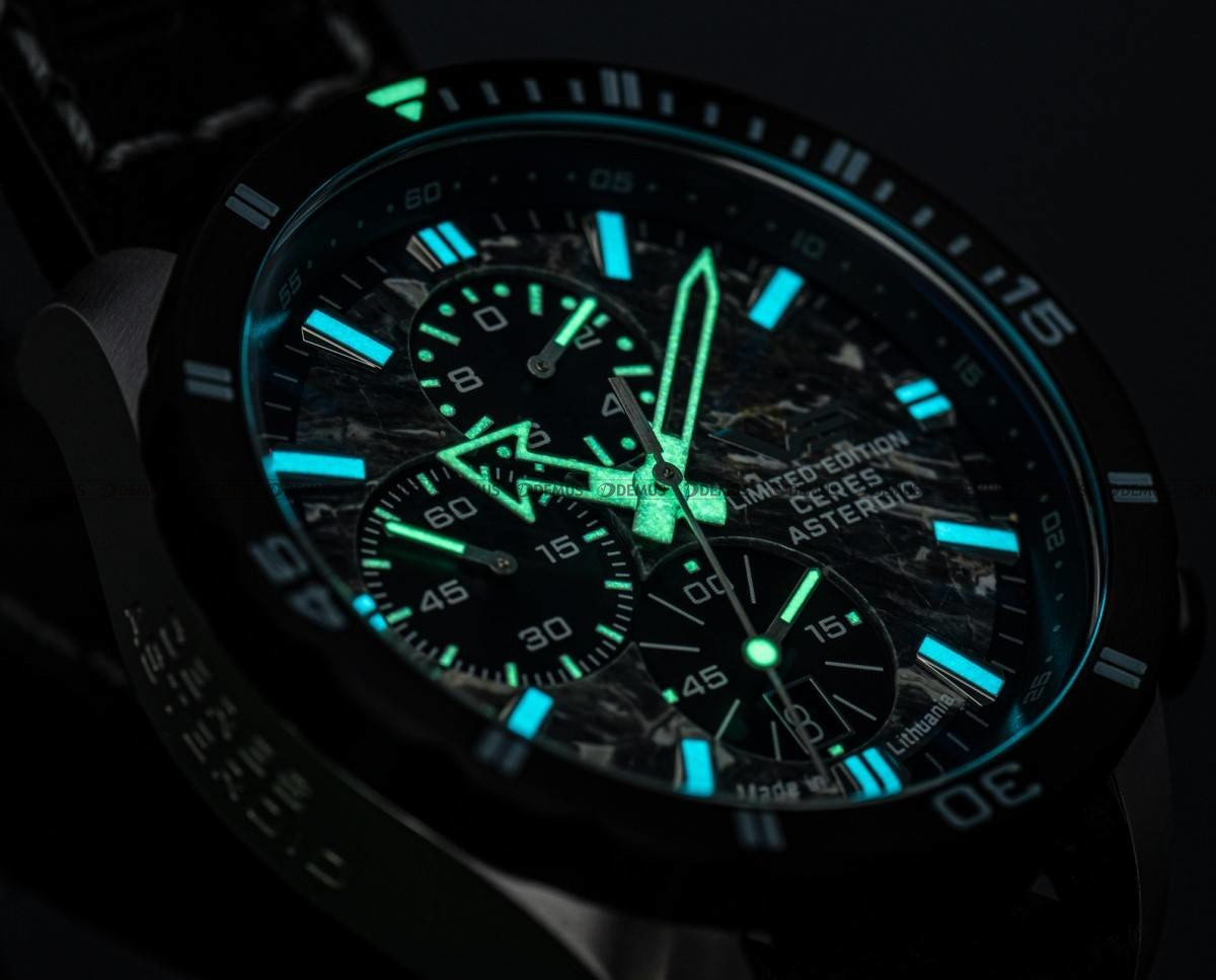 specjalne pokrycie wskazówek zegarka, delikatnie podświetlające w ciemnościach